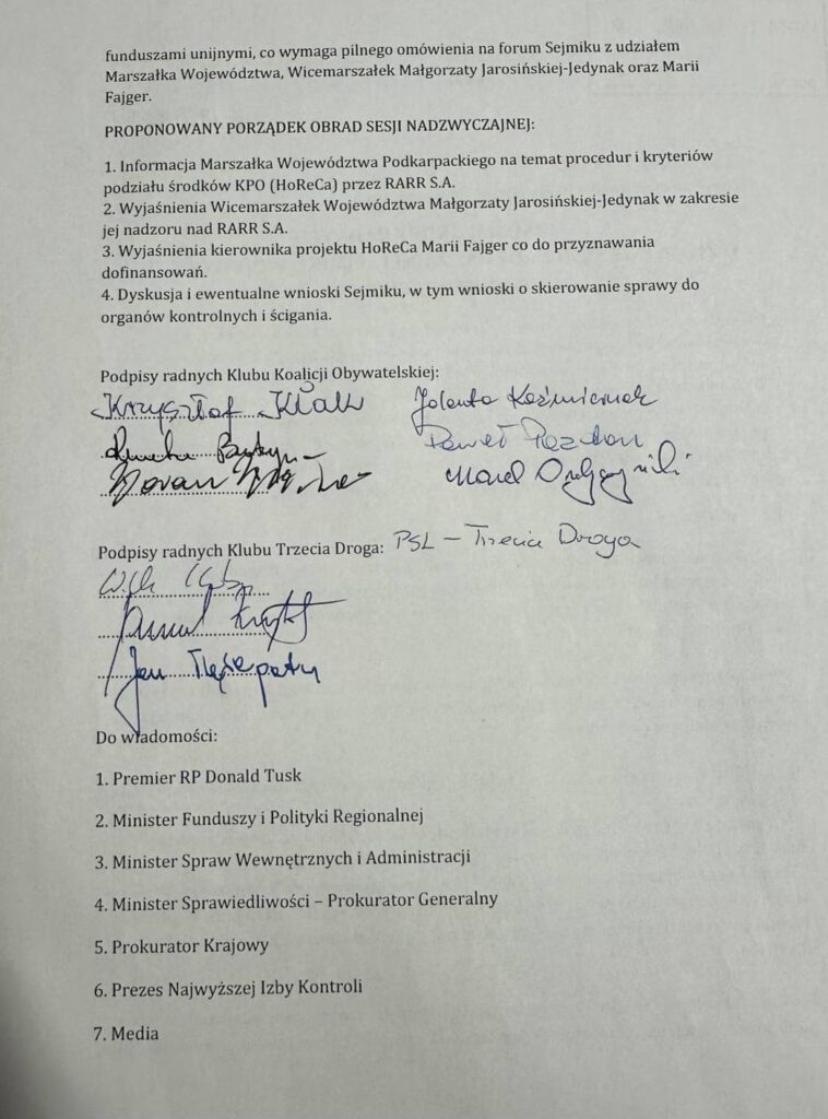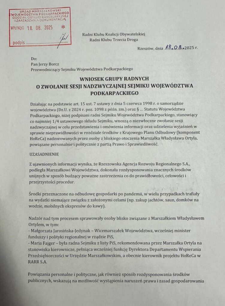 Dziś grupa radnych Koalicji Obywatelskiej i Trzeciej Drogi złożyła do przewodniczącego sejmiku Jerzego Borcza wniosek o zwołanie nadzwyczajnej sesji Sejmiku Województwa Podkarpackiego w związku z ujawnionymi nieprawidłowościami przy podziale środków z Krajowego Planu Odbudowy dla branży HoReCa.